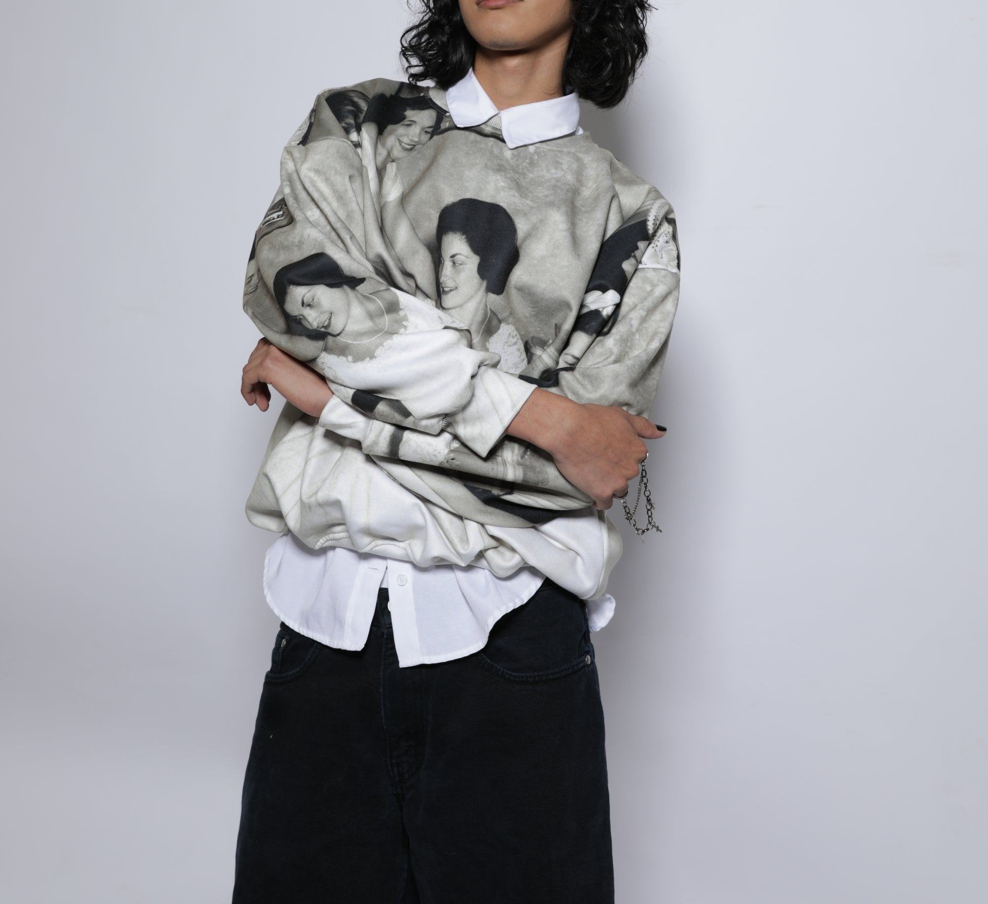 40% Cotton, 60% Polyester. Oversized unisex long sleeves Sweatshirt. Crewneck boxy fit. Seams are the same color of fabric and there are no zippers or buttons.