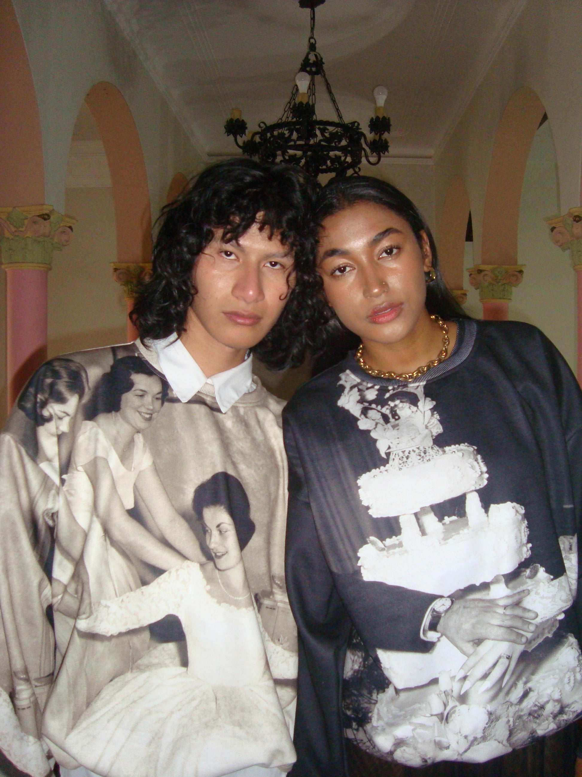 This sweater portraits Margaret and Eduardo holding hands over their wedding cake in 1970.