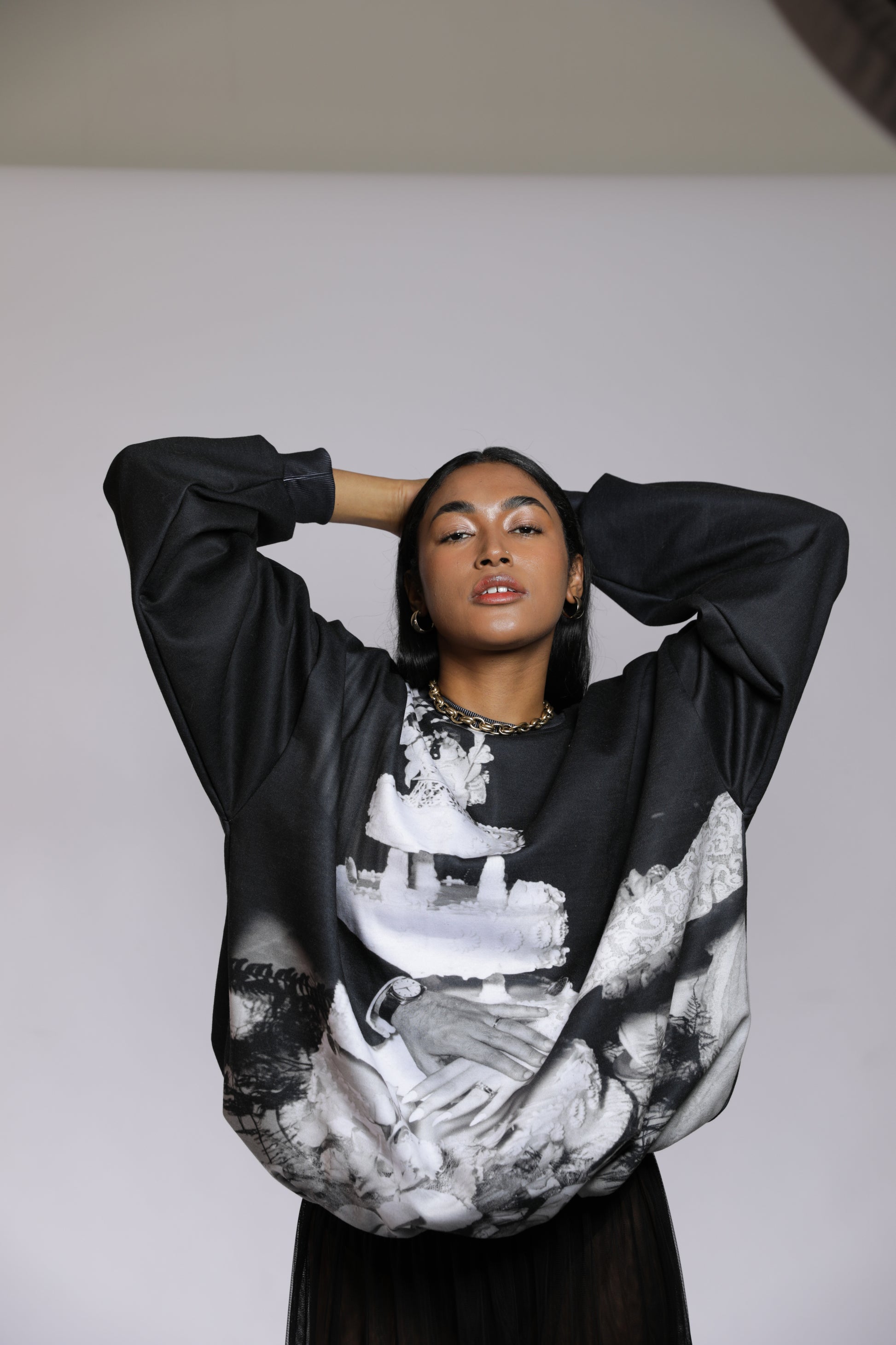 40% Cotton, 60% Polyester. Oversized unisex long sleeves Sweatshirt. Crewneck boxy fit. Seams are the same color of fabric and there are no zippers or buttons.
