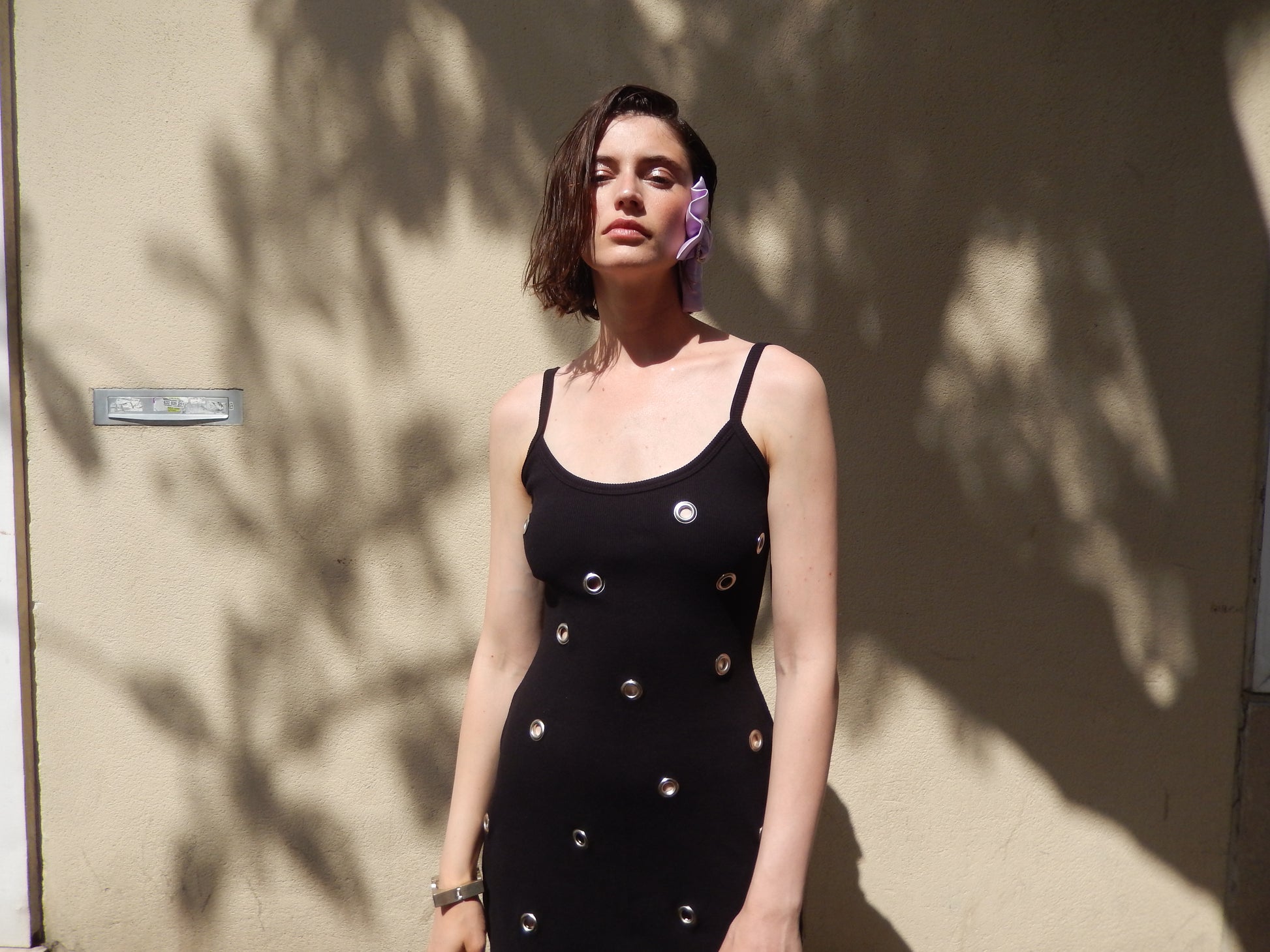 The perfect black dress with eyelet applications all over the front. Made of 100% Peruvian rib cotton.